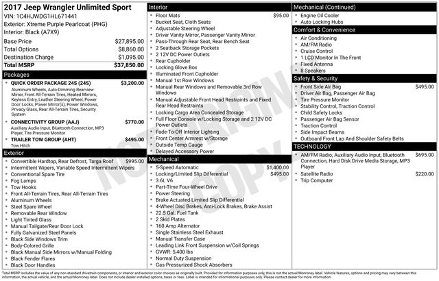 1-Yr SiriusXM Radio Service, 17" x 7.5" Aluminum Wheels, 4-Wheel Disc Brakes, 8 Speakers, ABS brakes, Air Conditioning, Anti-Spin Differential Rear Axle, Auto-Dimming Mirror w/Reading Lamp, Black 3-Piece Hard Top, Brake assist, Chrome/Leather Wrapped Shift Knob, Class II Receiver Hitch, Cloth Seats w/Adjustable Head Restraints, Compass, Connectivity Group, Deep Tint Sunscreen Windows, Delete Sunrider Soft Top, Driver door bin, Driver vanity mirror, Dual front impact airbags, Electronic Stability Control, Freedom Panel Storage Bag, Front 1-Touch Down Power Windows, Front anti-roll bar, Front Bucket Seats, Front Center Armrest w/Storage, Front fog lights, Integrated roll-over protection, Leather Wrapped Steering Wheel, Low tire pressure warning, Normal Duty Suspension, Occupant sensing airbag, Outside temperature display, Passenger door bin, Passenger vanity mirror, Power Convenience Group, Power Heated Mirrors, Power Locks, Power steering, Quick Order Package 24S, Rear anti-roll bar, Rear Window Defroster, Rear Window Wiper/Washer, Remote Keyless Entry, Remote USB Port, Security Alarm, SIRIUS Satellite Radio, Speed control, Split folding rear seat, Steering wheel mounted audio controls, Supplemental Front Seat Side Airbags, Tachometer, Tilt steering wheel, Tire Pressure Monitoring Display, Traction control, Trailer Tow Group, Trailer Tow w/4-Pin Connector Wiring, Trip computer, Uconnect Voice Command w/Bluetooth, Variably intermittent wipers, Vehicle Information Center.