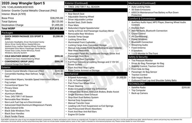 If youâre looking for iconic Jeep capability with everyday comfort and convenience features, this 2020 Jeep Wrangler Sport S delivers. Equipped with the Cold Weather Group and Convenience Group, this Wrangler offers heated seats, a heated steering wheel, and modern connectivity while maintaining the rugged off-road performance Jeep is known for.