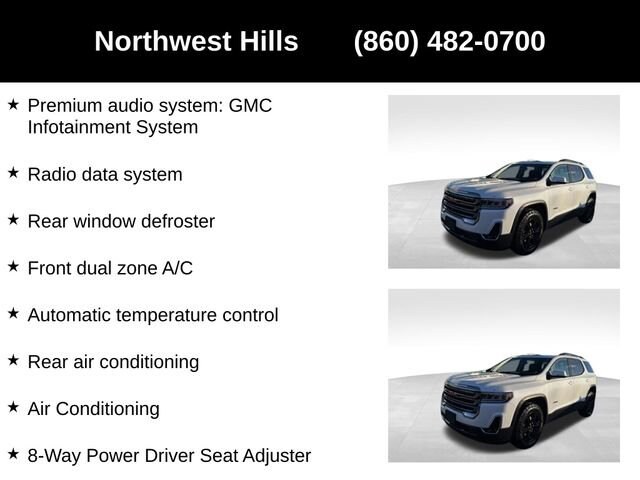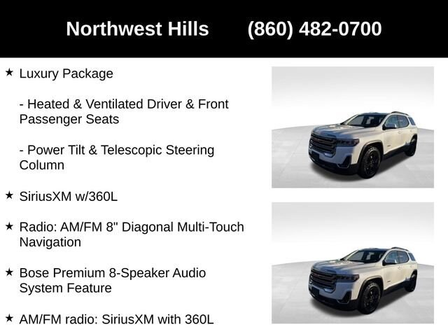 2022 GMC Acadia AT4**CAR BRAVO CERTIFIED **, AWD, Jet Black Leather, 170 Amp Alternator, 3.49 Final Drive Axle Ratio, 3rd row seats: split-bench, 4-Way Manual Passenger Seat Adjuster, 4-Wheel Disc Brakes, 6-Passenger (2-2-2 Seating Configuration), 8 Speakers, 8-Way Power Driver Seat Adjuster, 8-Way Power Passenger Seat Adjuster, 8 Multi-Color Enhanced Dr Instrument Info Display, ABS brakes, Air Conditioning, Alloy wheels, AM/FM radio: SiriusXM with 360L, Apple CarPlay/Android Auto, Auto High-beam Headlights, Auto-dimming Rear-View mirror, Automatic temperature control, Black Center Caps w/Red GMC Logo (LPO), Bose Premium 8-Speaker Audio System Feature, Brake assist, Bumpers: body-color, Compass, Delay-off headlights, Driver door bin, Driver vanity mirror, Dual front impact airbags, Dual front side impact airbags, Dual SkyScape 2-Panel Power Sunroof, Electronic Stability Control, Emergency communication system: OnStar and GMC Connected Services capable, Four wheel independent suspension, Front anti-roll bar, Front Bucket Seats, Front Center Armrest, Front dual zone A/C, Front fog lights, Front License Plate Bracket, Front reading lights, Fully automatic headlights, Garage door transmitter, HD Surround Vision, Heads-Up Display, Heated & Ventilated Driver & Front Passenger Seats, Heated door mirrors, Heated Driver & Front Passenger Seats, Heated front seats, Heated Rear Outboard Seating Positions, Heated Steering Wheel, Heavy-Duty Cooling System, Hitch Guidance w/Hitch View, Illuminated entry, Knee airbag, Low tire pressure warning, Luxury Package, Memory Package, Navigation System, Not Equip w/Ventilated Seat Cushion Blower Motor, Not Equipped w/Front & Rear Park Assist, Occupant sensing airbag, Outside temperature display, Overhead airbag, Overhead console, Panic alarm, Passenger door bin, Passenger vanity mirror, Power door mirrors, Power Driver Lumbar Control Seat Adjuster, Power driver seat, Power Liftgate, Power Passenger Lumbar Control Seat Adjuster, Power steering, Power Tilt & Telescopic Steering Column, Power windows, Power-Adjustable Body-Color Outside Heated Mirrors, Preferred Equipment Group 4SB, Preferred Package, Premium audio system: GMC Infotainment System, Premium Cloth Seat Trim, Radio data system, Radio: AM/FM 8 Diagonal Multi-Touch Navigation, Rear air conditioning, Rear anti-roll bar, Rear reading lights, Rear window defroster, Rear window wiper, Remote keyless entry, Roof rack: rails only, Security system, SiriusXM w/360L, Speed control, Speed-sensing steering, Spoiler, Steering wheel mounted audio controls, Tachometer, Technology Package, Telescoping steering wheel, Tilt steering wheel, Traction control, Trailering Assist Guidelines, Trailering Package, Trip computer, Turn signal indicator mirrors, Variably intermittent wipers, Voltmeter, Wheels: 17 Gloss Black Aluminum, Wireless Apple CarPlay/Wireless Android Auto.Say Yes to Sullivan! Our Dealer Conveyance fee is only $479!GMC Certified Pre-Owned Details:* 172 Point Inspection* Limited Warranty: 12 Month/12,000 Mile (whichever comes first) from certified purchase date* Transferable Warranty* Powertrain Limited Warranty: 72 Month/100,000 Mile (whichever comes first) from original in-service date* Roadside Assistance* Warranty Deductible: $0* 24 months/24,000 miles (whichever comes first) Certified Pre-Owned Scheduled Maintenance Plan and 3 days/150 miles (whichever comes first) Vehicle Exchange Program. SiriusXM 3-month trial subscription* Vehicle History