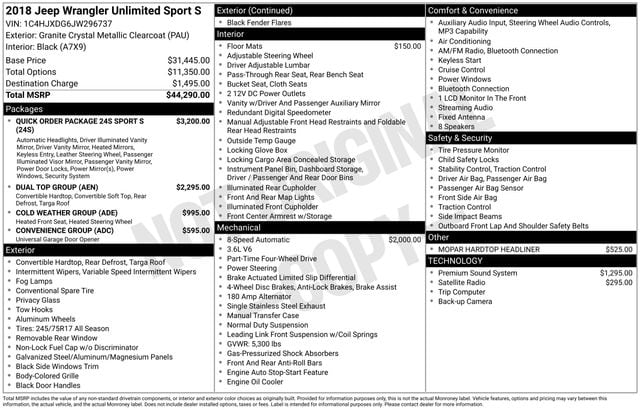1-Yr SiriusXM Radio Service, 220 Amp Alternator, 3.45 Rear Axle Ratio, 4-Wheel Disc Brakes, 8 Speakers, ABS brakes, Air Conditioning, Alpine Premium Audio System, AM/FM radio, Automatic Headlamps, Black 3-Piece Hard Top, Brake assist, Cloth Low-Back Bucket Seats, Cold Weather Group, Compass, Convenience Group, Deep Tint Sunscreen Windows, Delay-off headlights, Driver door bin, Driver vanity mirror, Dual front impact airbags, Dual front side impact airbags, Dual Top Group, Electronic Stability Control, For More Info, Call 800-643-2112, Freedom Panel Storage Bag, Front 1-Touch Down Power Windows, Front anti-roll bar, Front Bucket Seats, Front Center Armrest w/Storage, Front fog lights, Front reading lights, Heated Front Seats, Heated Steering Wheel, Integrated roll-over protection, Leather Wrapped Steering Wheel, Low tire pressure warning, MOPAR All-Weather Floor Mats, MOPAR Hardtop Headliner, Non-Lock Fuel Cap w/o Discriminator, Normal Duty Suspension, Occupant sensing airbag, Outside temperature display, ParkView Rear Back-Up Camera, Passenger door bin, Passenger vanity mirror, Power Heated Mirrors, Power steering, Premium Black Sunrider Soft Top w/Dual Top Group, Quick Order Package 24S Sport S, Radio data system, Radio: Uconnect 3 w/5" Display, Rear anti-roll bar, Rear reading lights, Rear Window Defroster, Rear Window Wiper/Washer, Remote Keyless Entry, Security Alarm, SiriusXM Satellite Radio, Speed control, Speed Sensitive Power Locks, Split folding rear seat, Steering wheel mounted audio controls, Sun Visors w/Illuminated Vanity Mirrors, Tachometer, Telescoping steering wheel, Tilt steering wheel, Traction control, Trip computer, Universal Garage Door Opener, Variably intermittent wipers, Wheels: 17" x 7.5" Black Steel Styled, Wheels: 17" x 7.5" Tech Silver Aluminum.