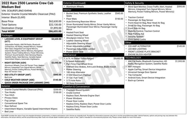 The 2022 Ram 2500 Laramie is a heavy-duty pickup that delivers serious towing capability, premium comfort, and aggressive styling. Equipped with the Night Edition, Bed Utility Group, and Laramie Level B Package, this truck is built to handle demanding jobs while keeping you comfortable and connected.