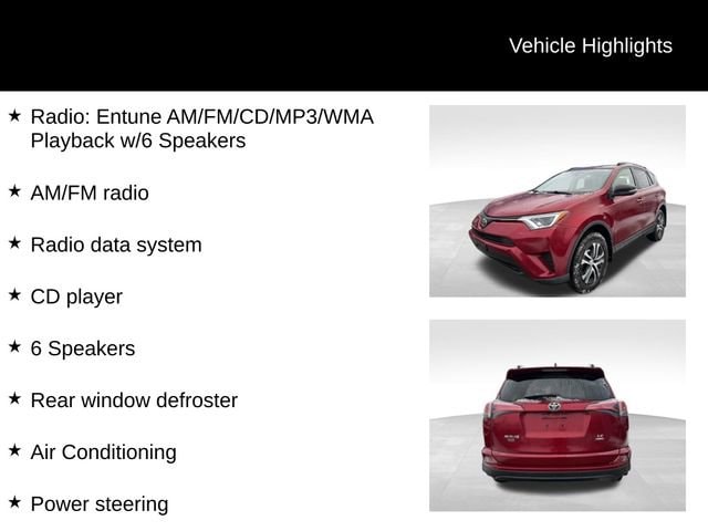 2018 Toyota RAV4 LEAWD, Black Cloth, 4-Wheel Disc Brakes, 4.071 Axle Ratio, 6 Speakers, ABS brakes, Air Conditioning, AM/FM radio, Auto High-beam Headlights, Brake assist, Bumpers: body-color, CD player, Driver door bin, Driver vanity mirror, Dual front impact airbags, Dual front side impact airbags, Electronic Stability Control, Exterior Parking Camera Rear, Fabric Seat Trim, Four wheel independent suspension, Front anti-roll bar, Front Bucket Seats, Front Center Armrest, Front reading lights, Fully automatic headlights, Illuminated entry, Knee airbag, Low tire pressure warning, Occupant sensing airbag, Outside temperature display, Overhead airbag, Overhead console, Panic alarm, Passenger door bin, Passenger vanity mirror, Power door mirrors, Power steering, Power windows, Radio data system, Radio: Entune AM/FM/CD/MP3/WMA Playback w/6 Speakers, Rear anti-roll bar, Rear seat center armrest, Rear window defroster, Rear window wiper, Remote keyless entry, Speed control, Speed-sensing steering, Split folding rear seat, Spoiler, Steering wheel mounted audio controls, Tachometer, Telescoping steering wheel, Tilt steering wheel, Traction control, Trip computer, Wheels: 17 x 6.5J.Say Yes to Sullivan! Our Dealer Conveyance fee is only $479!Awards:* 2018 KBB.com 10 Best SUVs Under $25,000 * 2018 KBB.com 10 Most Awarded Brands * 2018 KBB.com Best Resale Value Awards